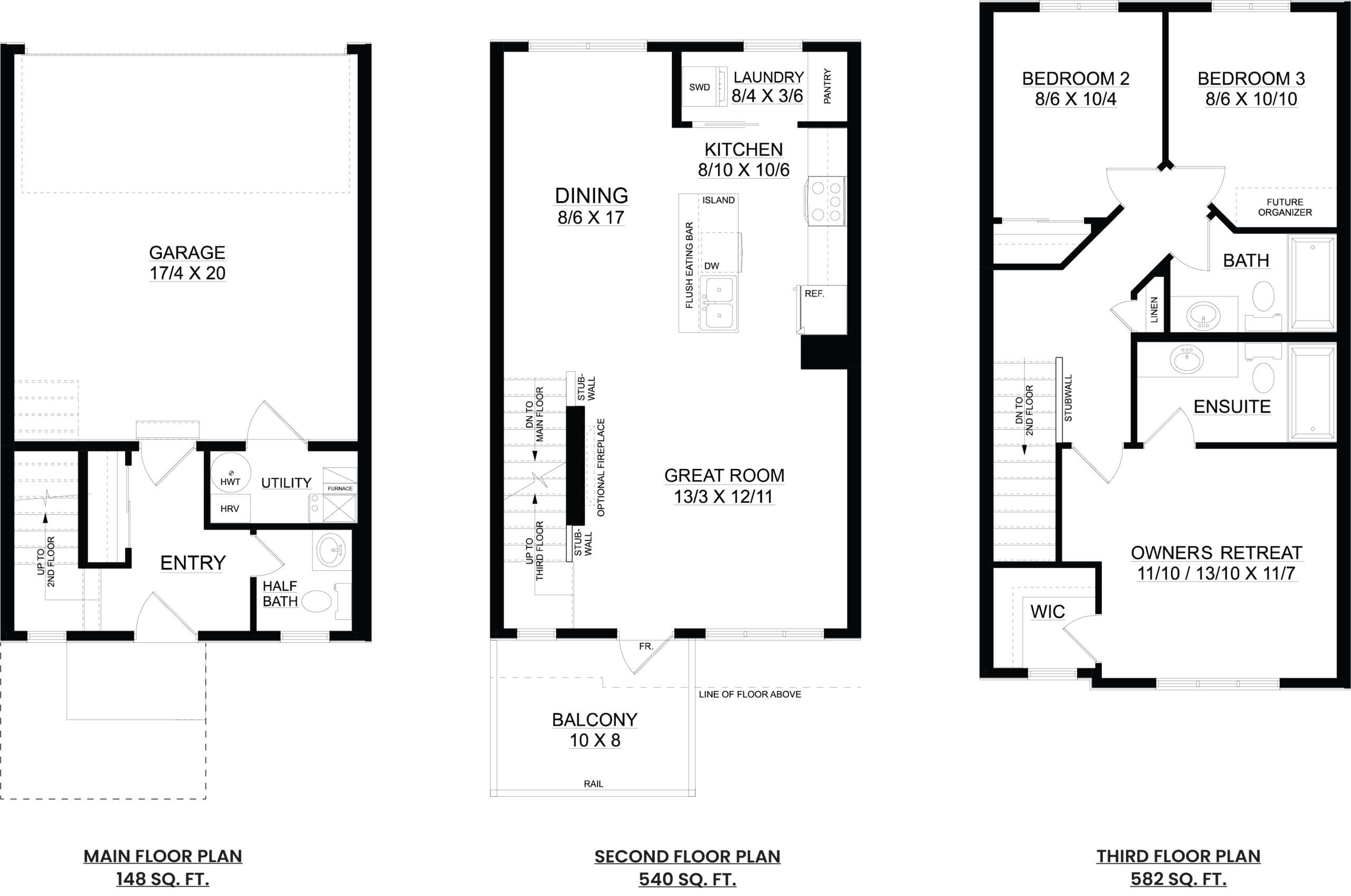 3 Beds 2.5 Baths 1270 SqFt Three-storey Townhome
